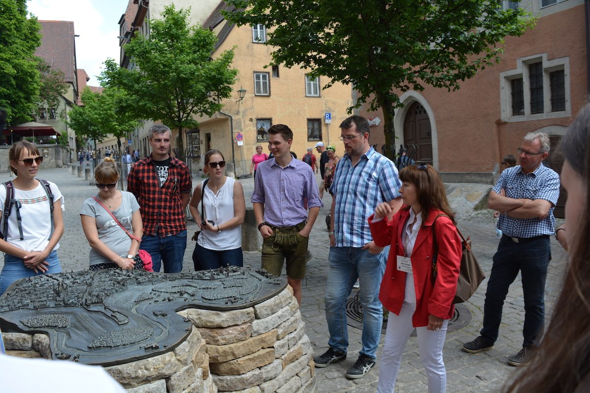 Am Nachmittag konnten wir bei einer spannenden Stadtführung einiges über die beachtliche Geschichte Rothenburgs erfahren, bspw. dass die „Bäckertaufe“ kein so angenehmes Ereignis war, wie der Name vermuten lässt oder auf welche Geheimsymbole an den Häuserwänden man achten sollte. Zu vielen Sehenswürdigkeiten hörten wir nette Anekdoten, in den vielleicht auch ein bisschen Wahrheit stecken könnte. Jedenfalls wissen wir jetzt, dass der Rothenburger „Meistertrunk“ ein echtes Meisterwerk war.