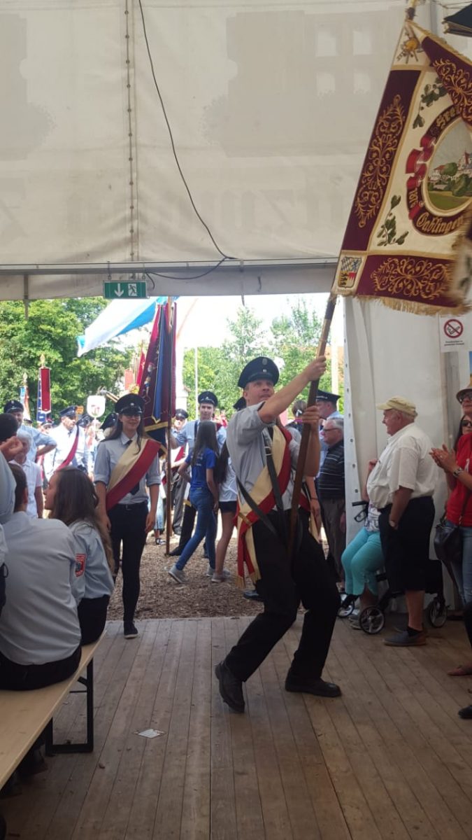 Bekanntermaßen ist das Highlight eines jeden Feuerwehrfests der Fahneneinzug ins Festzelt. Mit großem Applaus schwenkte unser Fähnrich – Alexander  Reinsch – die Vereinsfahne ins vollbesetzte Zelt.