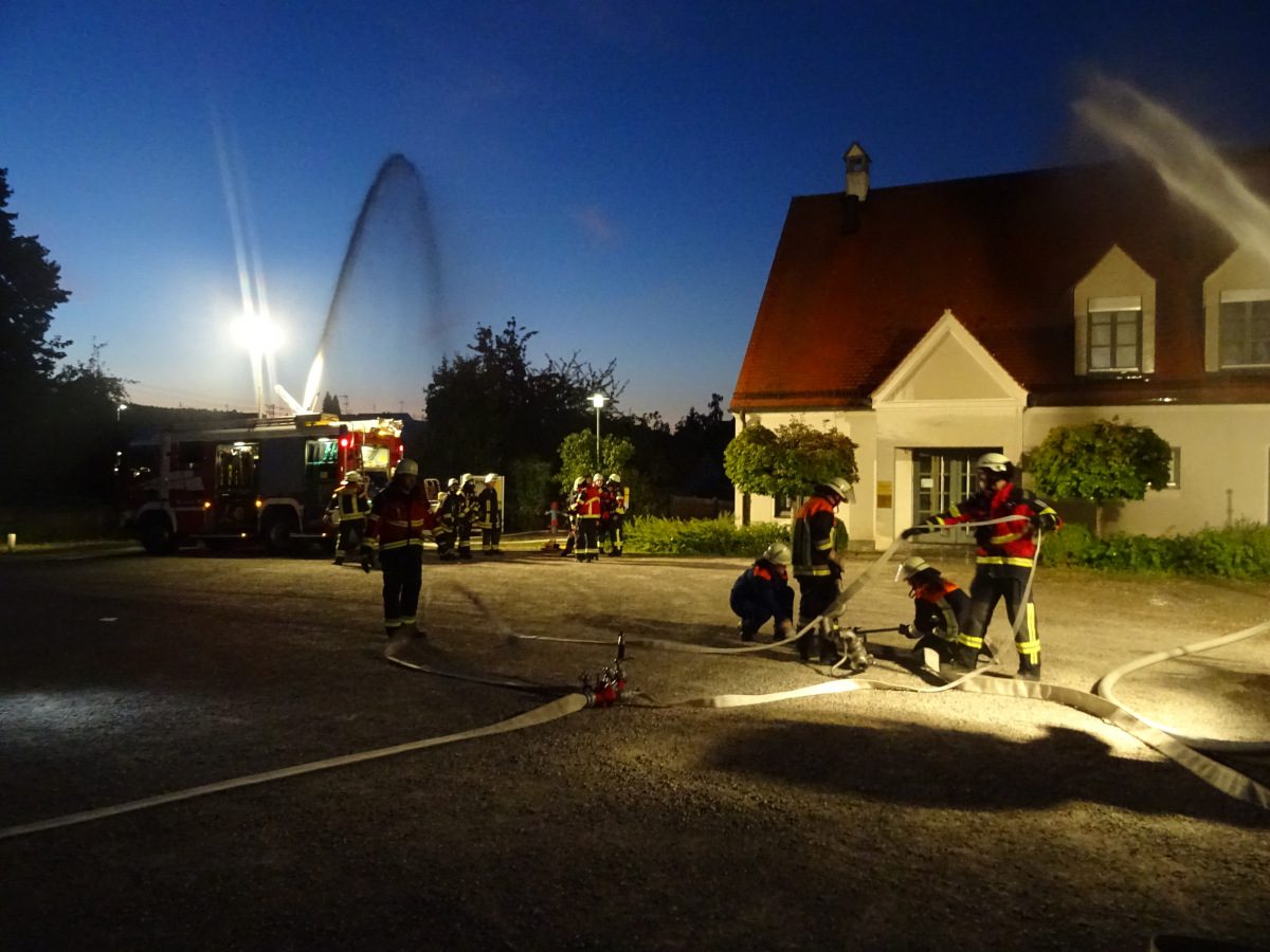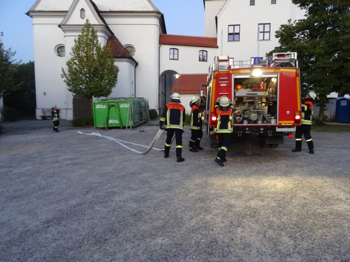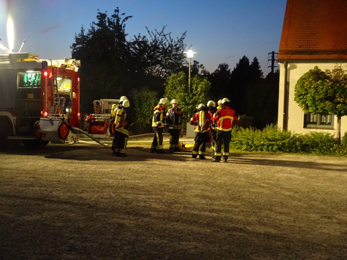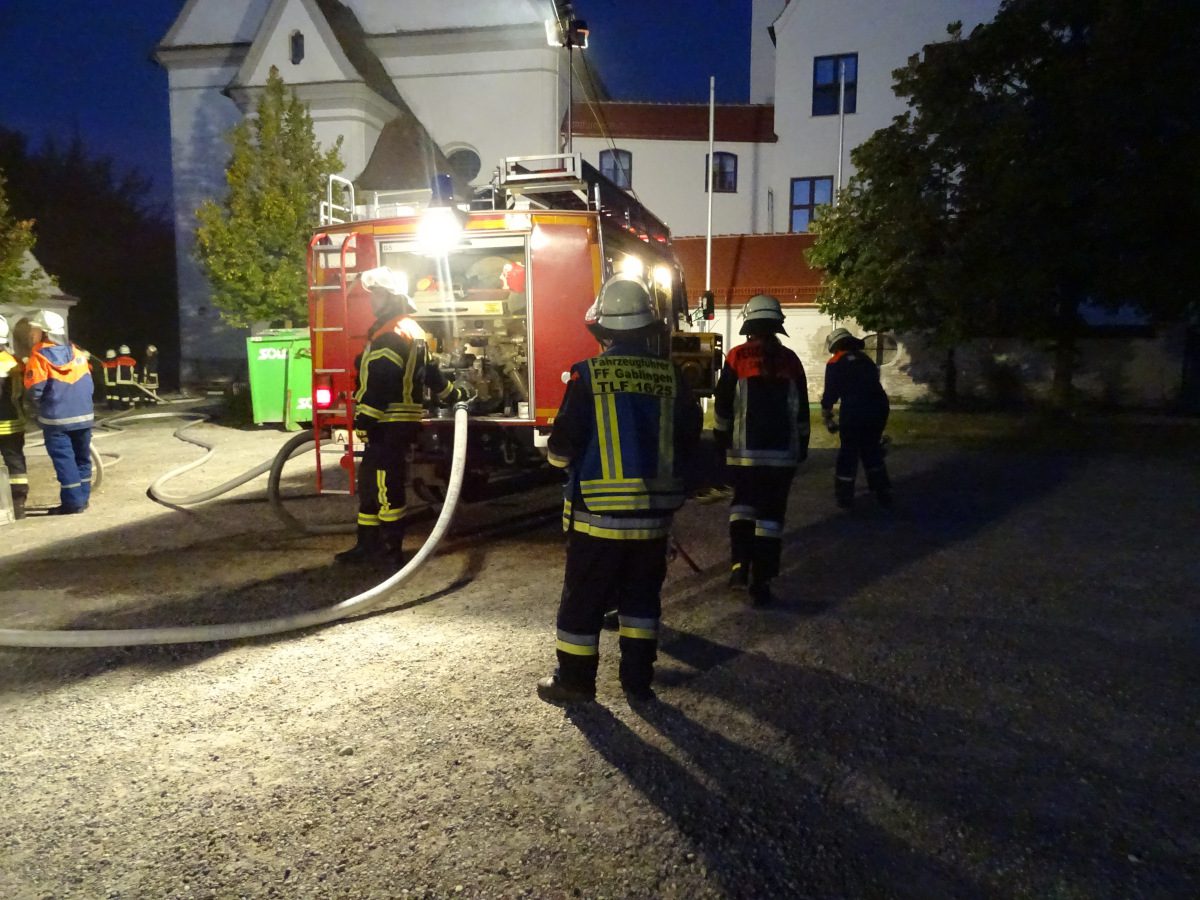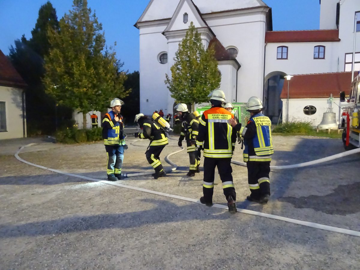 Blaulichter zucken hektisch über die Hausfassaden rund um den Kirchplatz Gablingen, Kieselsteine knirschen unter Stiefeln, man hört das Klappern von Aluminiumkupplungen, das Geräusch von einatmenden Atemschutzgeräteträgern… Diese Eindrücke waren am Donnerstag, den 12. September abends auf dem Kirchplatz zu erleben. Grund hierfür war eine gemeinsame Übung der Feuerwehren aus Batzenhofen und Gablingen.