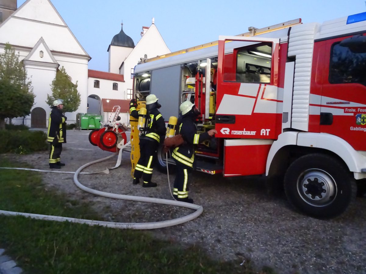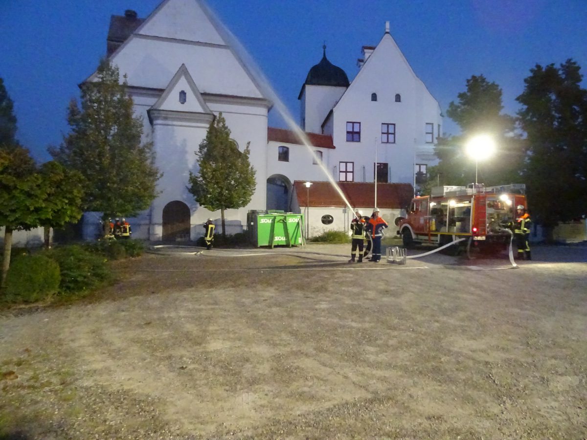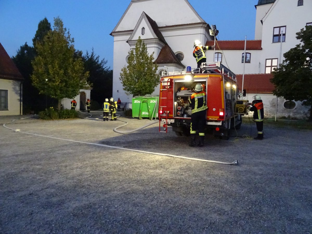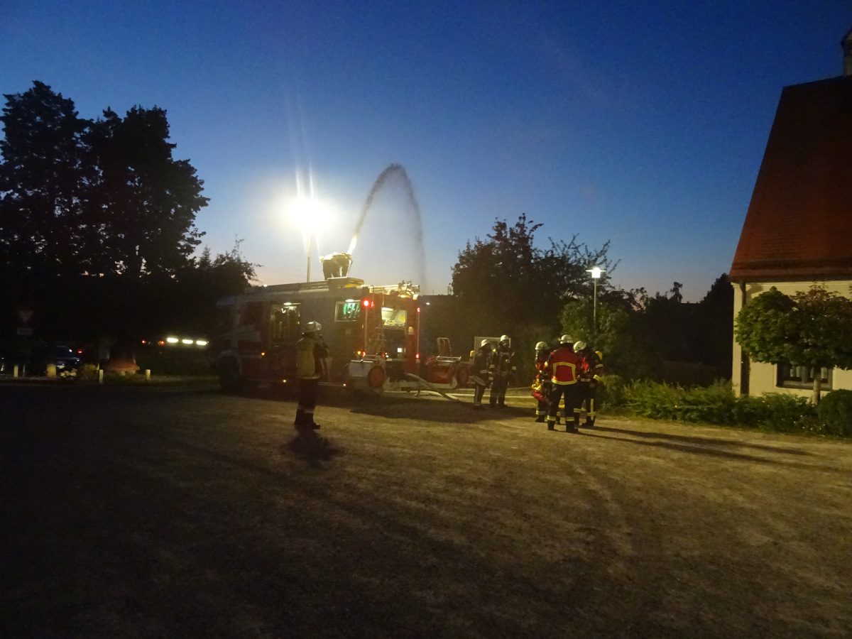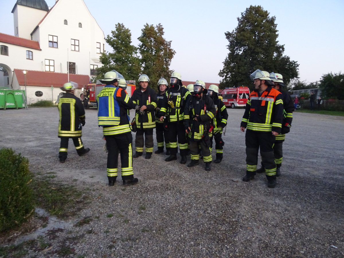 Blaulichter zucken hektisch über die Hausfassaden rund um den Kirchplatz Gablingen, Kieselsteine knirschen unter Stiefeln, man hört das Klappern von Aluminiumkupplungen, das Geräusch von einatmenden Atemschutzgeräteträgern… Diese Eindrücke waren am Donnerstag, den 12. September abends auf dem Kirchplatz zu erleben. Grund hierfür war eine gemeinsame Übung der Feuerwehren aus Batzenhofen und Gablingen.