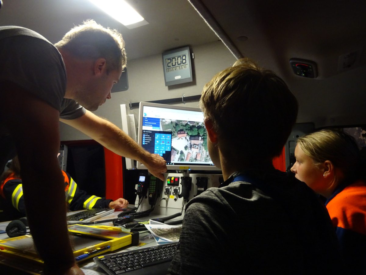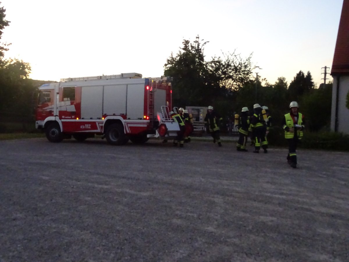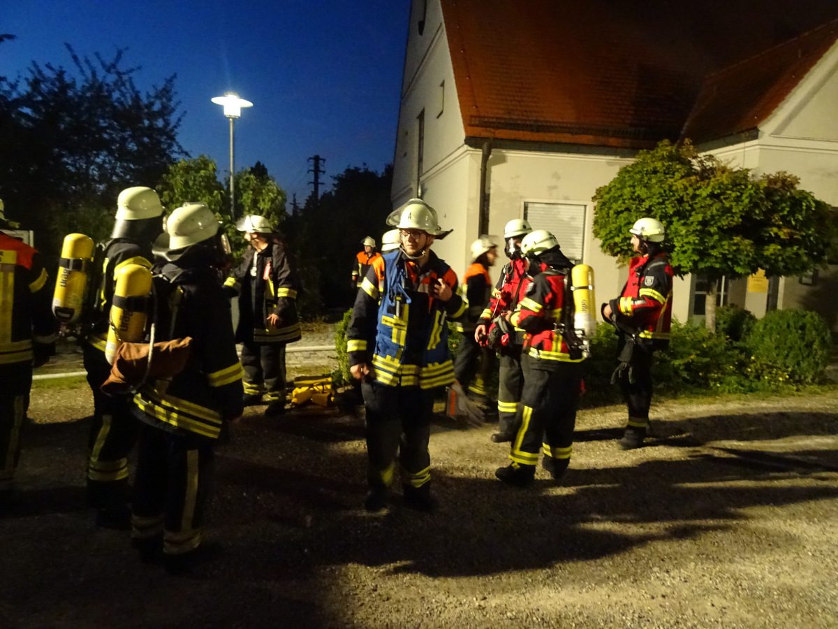 Schnell wurde die erste Person vom einem der Atemschutztrupps entdeckt und ins Freie gebracht. Dort angekommen berichtete diese, dass sich noch zwei Personen im Gebäude befinden sollen. Ein weiterer Atemschutztrupp der Feuerwehr Batzenhofen unterstützte ab dieser Meldung die Personensuche. Die beiden Vermissten wurden ebenso schnell gefunden und ins Freie gebracht. Plötzlich wurde es jedoch noch einmal hektisch, als ein „MAYDAY, MAYDAY, MAYDAY ein Atemschutzträger bewusstlos“ über den Funk ertönte. Schnell rüstete sich der bereitstehende Rettungstrupp aus und begab sich in das Gebäude, um den verunfallten Kameraden und seinen zweiten Truppmann zu retten. Dies geschah nach ca. 2,5 Minuten. Nachdem der Geräteträger gerettet war, hieß es „Durchsage an alle Einsatzkräfte: Übungsende“