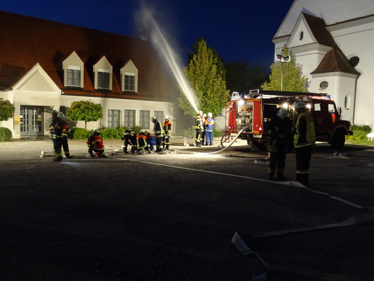 Um 19:45 Uhr bekamen die Einsatzkräfte in Batzenhofen und Gablingen die fiktive Alarmmeldung „Brand 3 Person, Brand Pfarrheim Gablingen, Pfarrer-Ledermann-Platz“. Der Einsatzleitwagen, das Hilfeleistungslöschfahrzeug sowie das Tanklöschfahrzeug der Feuerwehr Gablingen fuhren direkt Richtung Pfarrheim. Dort angekommen zeigte sich das Ausmaß. Im Keller des Pfarrheims kam es bei Wartungsarbeiten der Heizung zu einer Verpuffung mit anschließendem Brand. Bis auf den Heizungsmonteur war zu diesem Zeitpunkt noch nicht bekannt wie viele Personen noch vermisst waren. Zwei Atemschutztrupps rüsteten sich aus und begaben sich ins innere des Gebäudes zur Personensuche. Währenddessen begannen die Kräfte des Tanklöschfahrzeugs mit einem Außenangriff. Besonderheit hierbei war jedoch die Wasserversorgung. Es wurde getestet, ob eine Wasserförderung über eine lange Wegstrecke ohne eine Verstärkerpumpe möglich ist. Hierzu wurde vom Löschgruppenfahrzeug eine Schlauchleitung von der Schmutterbrücke am Feuerwehrhaus, über die Schulstraße und die Treppe beim Kriegerdenkmal bis zum TLF verlegt. Die Kräfte aus Batzenhofen übernahmen ebenfalls die Wasserversorgung von der Schmutter unterhalb des Pumpenhauses und die Verkehrsabsicherung.