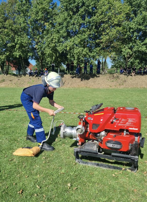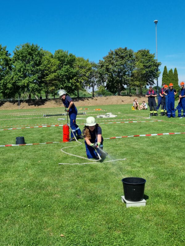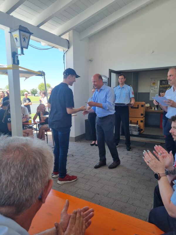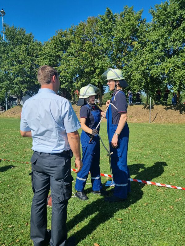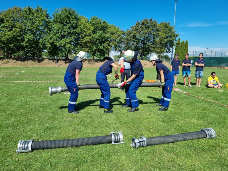 Mitte Juli fand das Kreisjugendzeltlager des Landkreises Augsburg am Sportplatz in Graben statt. Mit insgesamt 18 Jugendlichen war die Freiwillige Feuerwehr Gablingen in diesem Jahr wieder stark vertreten. Bereits Wochen vorher hatten sich die jungen Feuerwehranwärter zusammen mit den beiden Jugendwarten Michael Reiner und Johannes Pröll in zahlreichen Jugendübungen auf die anstehende Jungendleistungsspange, die Fokus des Wochenendes stand, vorbereitet. Am Samstag war es dann soweit und die sieben Mädels und Jungs durften ihr erlerntes Wissen bei der Abnahme der Prüfung unter Beweis stellen. Einfache Stiche und Knoten, das Benennen verschiedener Einsatzgerätschaften, das richtige Ausrollen von Schläuchen sowie das Zusammenkuppeln einer Saugleitung auf Zeit waren nur ein Teil der Aufgaben, die zur Grundausbildung gehören und stets beherrscht werden müssen. Im Anschluss überreichte Landrat Martin Sailer allen Prüflingen das Jungendleistungsabzeichen. Trotz der sommerlichen Temperaturen schlugen sich alle Teilnehmer wacker und absolvierten die Prüfung mit Bravour. Für eine Abkühlung und Badespaß am Nachmittag war ebenfalls gesorgt. Zum Schutz der Jugendlichen musste das Zeltlager aufgrund starker Unwetterwarnungen in der Region leider bereits am Samstagabend vorzeitig abgebrochen werden. Kein Grund sich die gute Laune vermiesen zu lassen, denn die Mädels und Jungs übernachteten stattdessen gemeinsam im Saal des Feuerwehrhauses, um das Wochenende am Sonntag wie geplant ausklingen zu lassen.