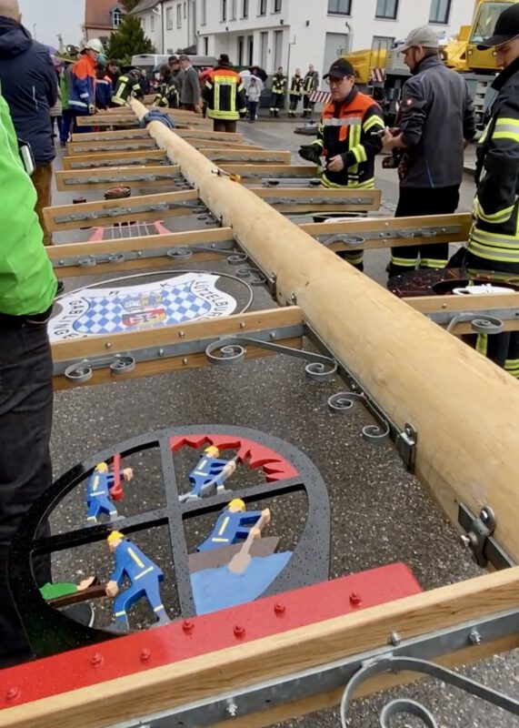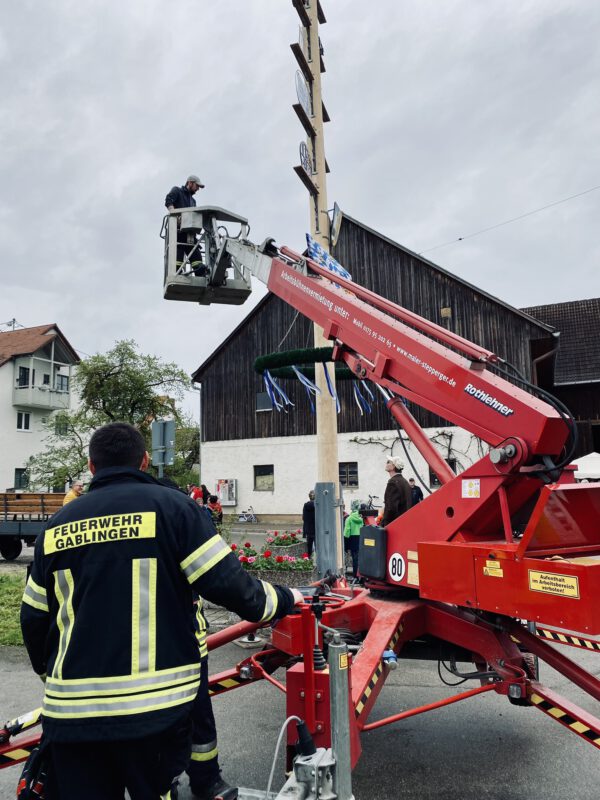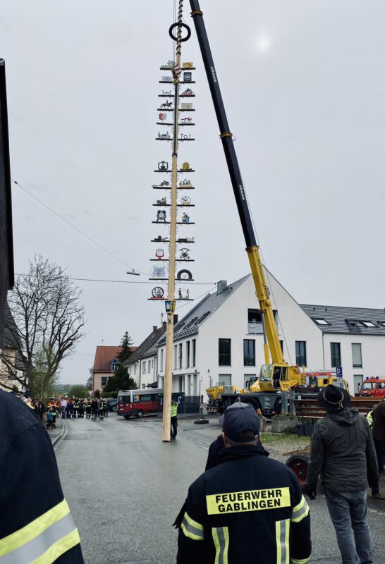 Am 01. Mai diesen Jahres war es wieder soweit. Der Maibaum in Gablingen wurde nach vier Jahren neu aufgestellt. Die Organisation übernahm diesmal eine Arbeitsgruppe, in der sich Ehrenamtliche aus verschiedenen Dorfvereinen engagierten. Gemeinsam wurden vorab die Aufgaben besprochen und anschließend verteilt. Auch wir als Freiwillige Feuerwehr beteiligten uns an den Arbeiten und unterstützen mit helfenden Händen beim Herrichten, der Maibaumwache, dem Aufstellen und natürlich beim Absichern der Straßen. Trotz Nieselregen durften beim Maibaumfest am Sonntagvormittag zahlreiche Bürger begrüßt werden, die das Eintreffen des Maibaums im Ortszentrum mit dem Pferdegespann begutachteten. Mit Hilfe eines Autokranes wurde der Maibaum aufgestellt und anschließend von Pfarrer Roger Nkou geweiht. Für das leibliche Wohl und gute Laune mit Tanz war ebenfalls gesorgt.
