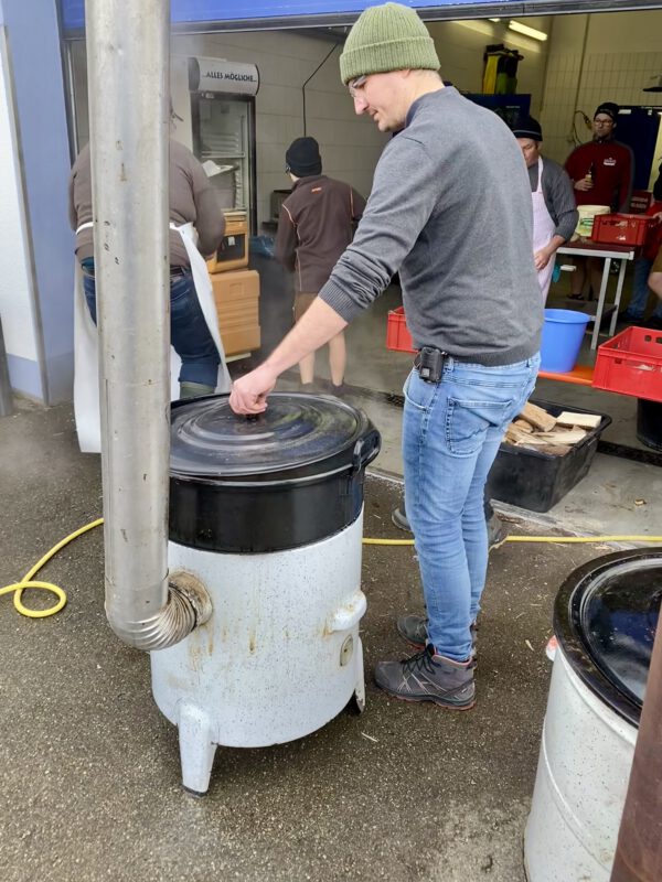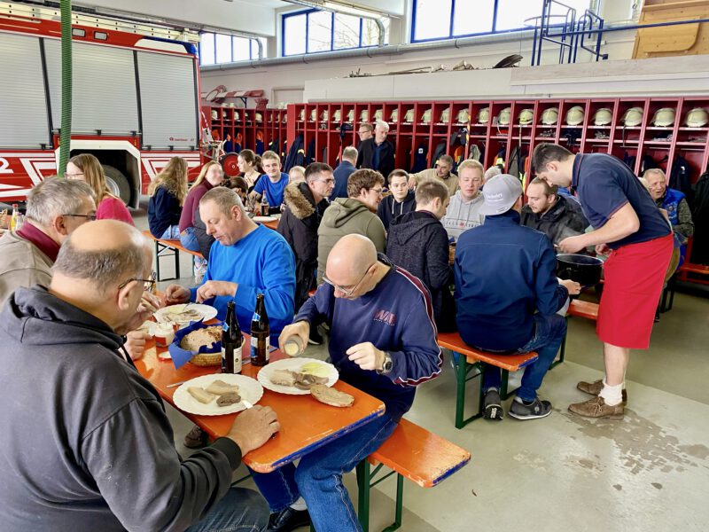 Ende November war es soweit – erstmals seit langem fand unser Kesselfleischessen für alle Vereinsmitglieder in traditioneller Form wieder statt. Zahlreiche aktive und passive Mitglieder waren im Feuerwehrgerätehaus herzlich willkommen. Ab 11 Uhr servierte unser Metzgerteam allerlei Spezialitäten vom Landschwein frisch aus dem Kessel zubereitet. Mit Bratkartoffeln und Brot als Beilagen war für jeden etwas dabei! Die Planung und Organisation hat sich gelohnt, denn es war ein tolles Beisammensein.