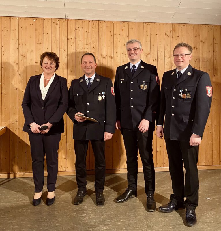 v.l. Karina Ruf (1. Bürgermeisterin), Christian Schaller, Dominik Merktle (1. Kommandant) und Christian Kaiser (1. Vorstand)